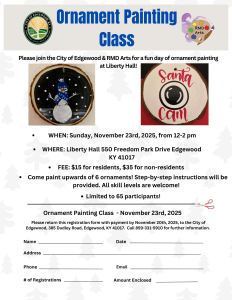 Please join the City of Edgewood and RMD Arts for a fun time of ornament painting. $15 – residents/$35 – non-residents, all ages and skill levels are welcome. Class is limited, please complete the registration form.