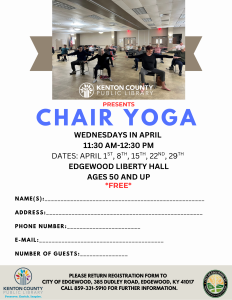 Chair Yoga – 4/1 by BNitschke | Mar 14, 2026 Join us for FREE Chair Yoga – Wednesdays in April from 11:30-12:30 at Liberty Hall (aka Senior Center). Please stop by or call the city building to register 859.331.5910. Click Here for the Chair Yoga Registration Form